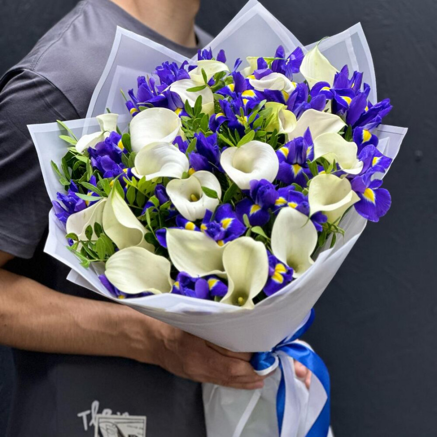 На фото букет из белых калл и синих ирисов. В составе: калла 19 шт, ирис 20 шт, писташ 9 шт, дизайнерская упаковка 3 шт, атласная лента 1 шт, . Все цветы свежие и ароматные, букет красиво оформлен и отлично подходит для подарка. Доступна доставка цветов или самовывоз.